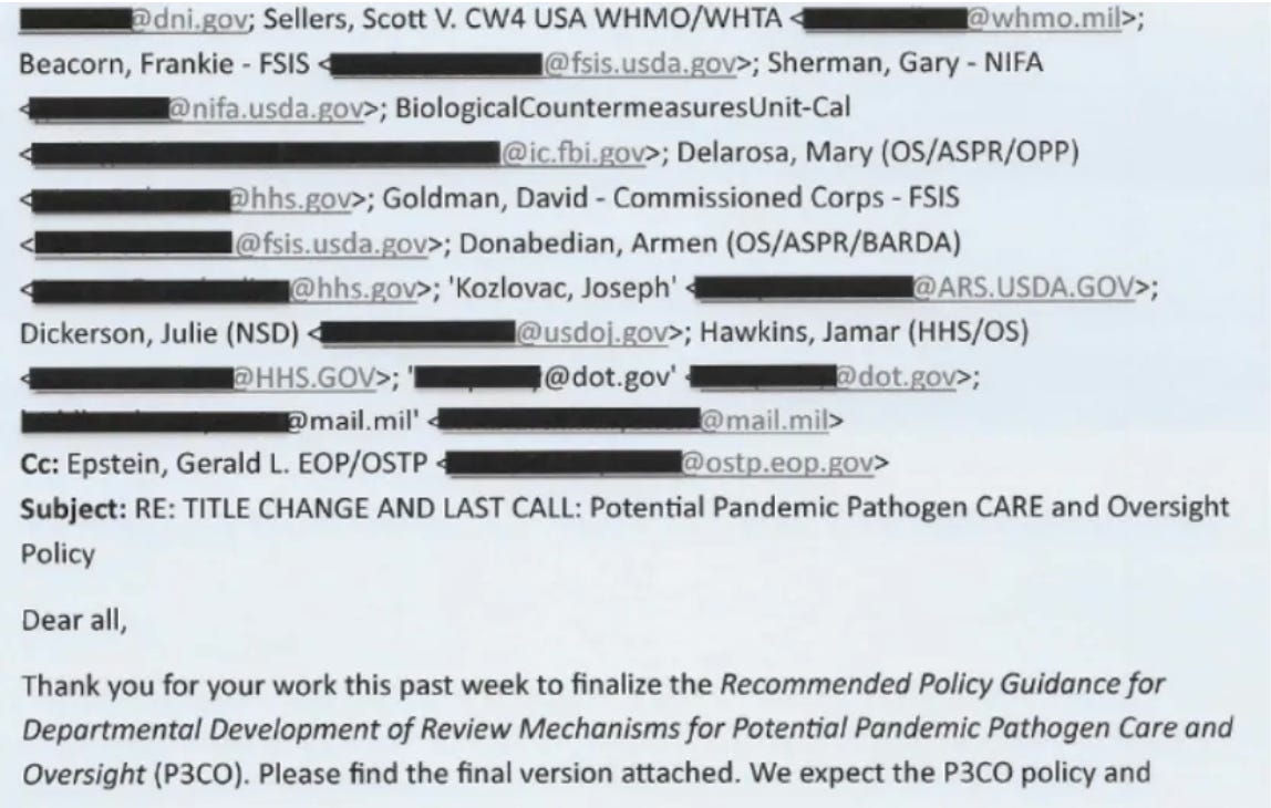 NOTE TO READERS: While nobody will reveal who exactly is working on this new policy, an intelligence official, who wishes to remain anonymous, sent me several emails from the last major update to gain-of-function virus research policy in 2017. When White House National Security Council Advisor Hillary Carter emailed the research policy’s final version, she copied in those who had participated in the process.