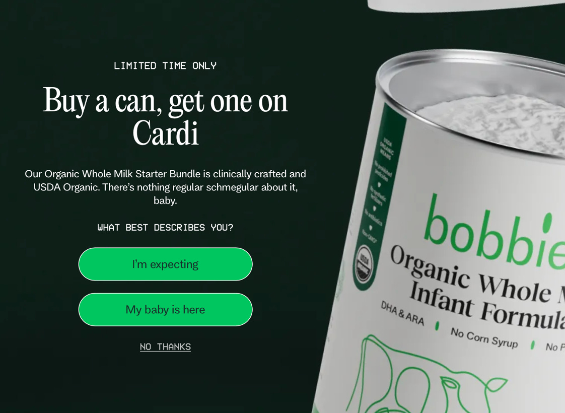 Furthermore, Bobbie is currently promoting a limited time offer on its website that reads, “Buy A Can, Get One on Cardi,” but the WHO code prohibits discount offers.