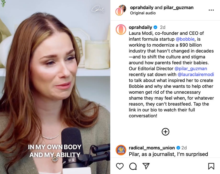 Modi has appeared in numerous interviews on social media where she appeals to vulnerable new moms with her own story about how she struggled to breastfeed which eventually inspired her to found Bobbie — a business that so far has generated $388 million.