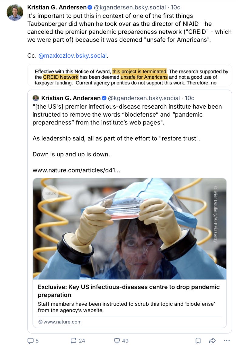 Just 10 days ago, Andersen was still complaining on Bluesky about the loss of his CREID grant that the NIH deemed “unsafe for Americans.”