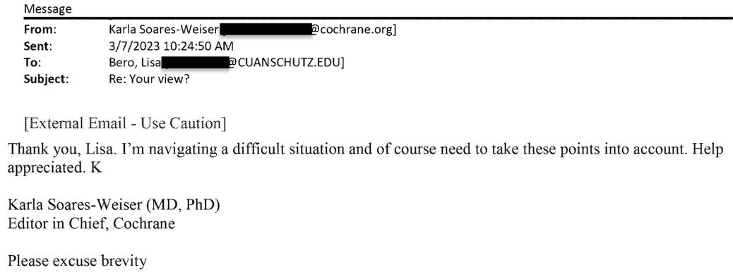 Emails find that Soares-Weiser appeared to be in a bit of panic, monitoring negative commentary about her decision to publish a statement without bothering to consult the scientists. “I had a challenging meeting with the [governing board] yesterday. I am holding on, stressed, but OK,” she emailed Lisa Bero.