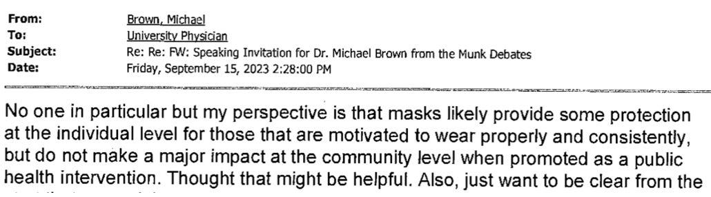 One of the first things I noticed was that Tufecki had emailed Michael Brown, a physician at Michigan State University, on February 24, 2023. According to other emails, I learned that Michael Brown had been the sign off editor for the mask review.