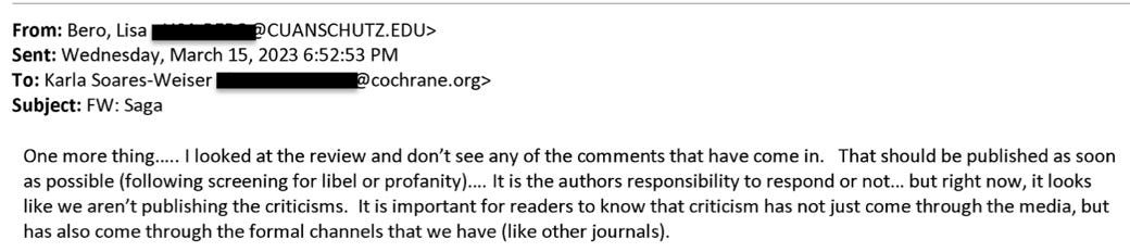 Bero then suggested to Soares-Weiser that Cochrane publish negative comments being submitted by outsiders criticizing the mask review. “That should be published as soon as possible (following screening for libel or profanity),” Bero emailed. “It is important for readers to know that criticism has not just come through the media, but through the formal channels that we have.”