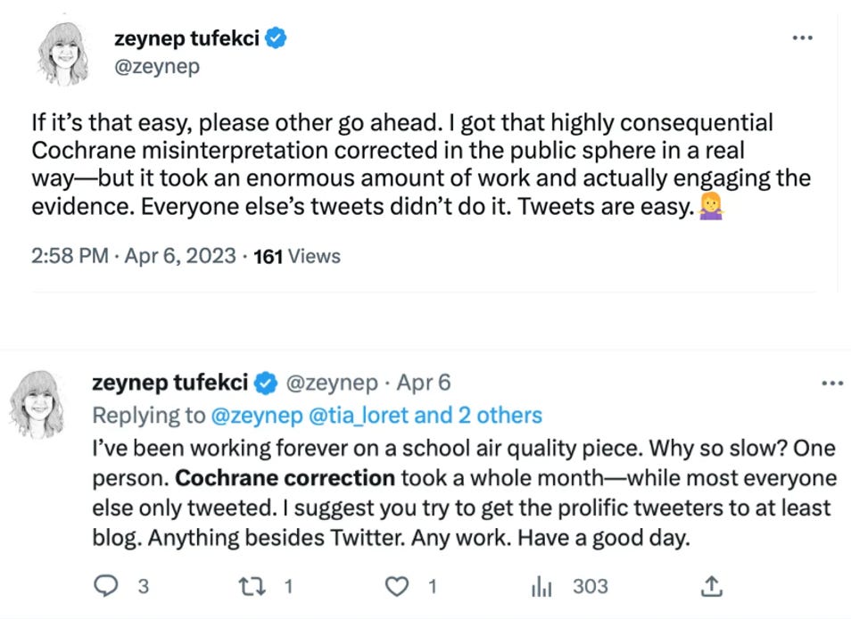 Shortly after bullying Cochrane’s Soares-Weiser to put out a statement claiming she would make changes to the mask review, Tufekci began tweeting that she had gotten the review “corrected.”