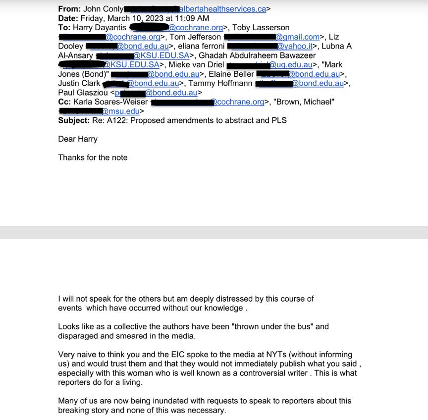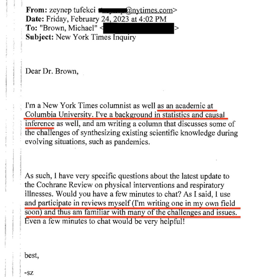 Hey guys, I had a piece last week in UnHerd discussing hundreds of emails I had gone through that found social media influencer Zeynep Tufekci pressured the prestigious medical nonprofit Cochrane to put out a statement attacking their own review that found there is little evidence that masks stop respiratory viruses. One of the people Tufekci interviewed for the piece also told me that she twisted his words, which is obvious from the emails.
