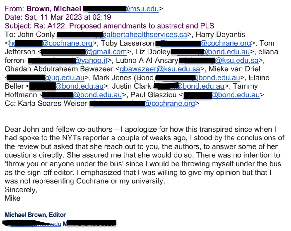 Brown also told me that he had told Tufekci to contact the scientists who wrote the Cochrane review, because they are the real experts. Duh! While he was the editor of the review, he hadn’t read each and every published study like the review authors.