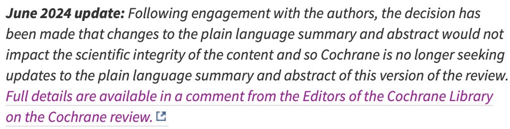 A month back, Soares-Weiser put out a correction to her prior statement, and now says that Cochrane will not make any changes to the mask review.