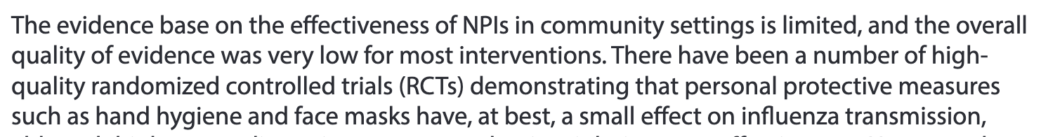 I then started digging around and found several scientific studies concluding masks don’t do much to stop respiratory viruses, as well as several examples of international medical bodies drawing similar conclusions. For example, the World Health Organizations stated in their 2019 pandemic preparedness plan, “There have been a number of high-quality randomised controlled trials (RCTs) demonstrating that personal protective measures such as hand hygiene and face masks have, at best, a small effect on influenza transmission.”