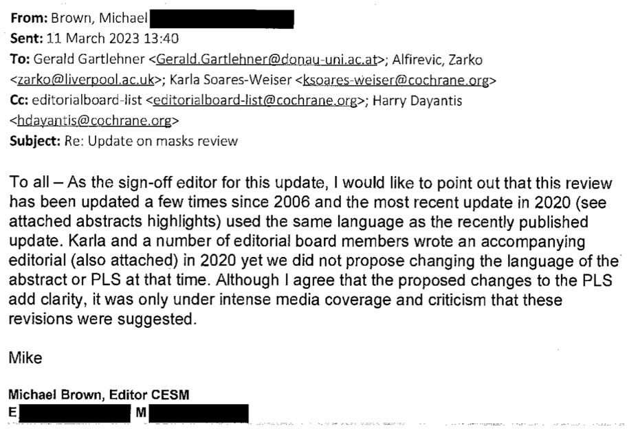 Brown then sent an email to Soares-Weiser and several of the Cochrane editors reminding them that changes were being considered to the mask review language, even though it was the same wording as had been used in the 2020 update.