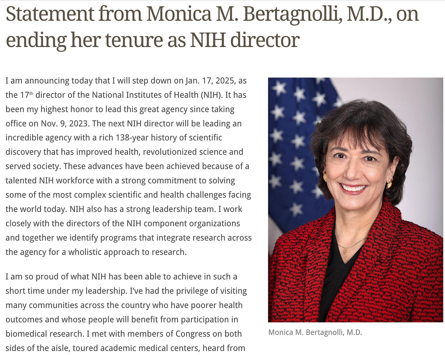 NIH Director Monica M. Bertagnolli stepped down from her position just a few days ago, and I’ve been told this happened after the Trump transition team advised her to resign. The administration will likely soon announce an interim director to run the agency until the Senate confirms Stanford’s Jay Bhattacharya to take over. Other NIH officials who involved themselves in corrupt activity during the pandemic will be receiving further calls from the Trump team that they will also be removed from leadership.