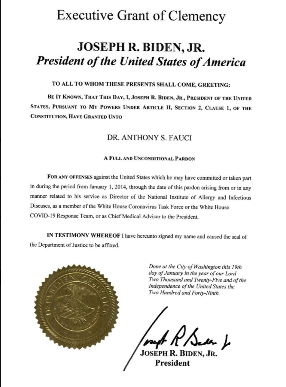 Expecting that President Biden would hand Tony Fauci a preemptive pardon, I’ve been working the last week reporting on crimes that the Department of Justice could charge Fauci with, because despite Biden’s claims to the contrary, some people are above the law. Sure enough, Biden signed the Fauci pardon just a few hours before he left office yesterday, and then sent the pardon to friendly journalism outlets to set the media narrative that Fauci was the target of unfair criticism and partisan attacks.
