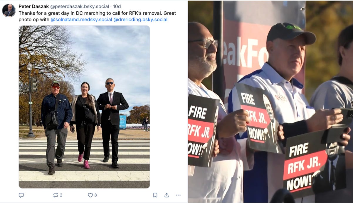 Once feted by Science Magazine’s Jon Cohen in a flattering, soft focus profile that was then promoted by Editor-in-Chief Holden Thorp, Daszak appears to have fallen on hard times, claiming that he is “unemployed and is now poor,” assertions that he might find hard to back up in court. Earlier this month, Daszak flew to Washington DC to participate in a march on the National Mall and posted pictures on Bluesky that show him holding a sign demanding HHS Secretary Kennedy be fired.