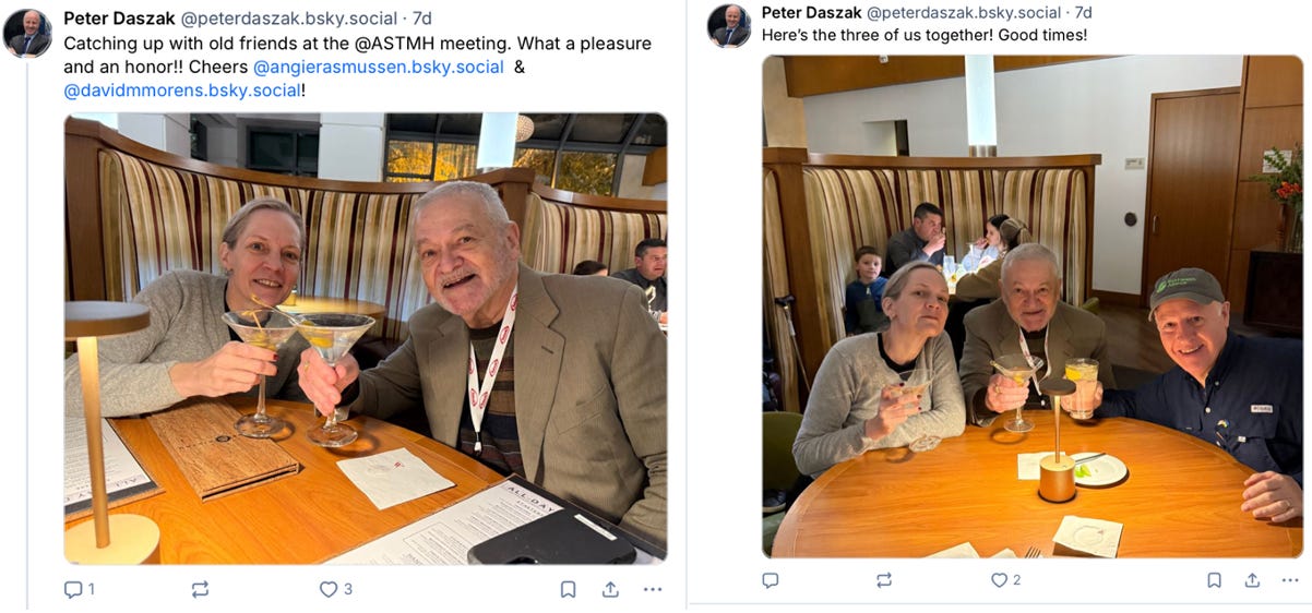 Days later, Daszak flew to Toronto for the annual meeting of the American Society of Tropical Medicine & Hygiene which charges $770 for members to attend. Seated at a Toronto restaurant, Daszak posted photos of himself having drinks with virologist Angela Rasmussen and David Morens, a former NIH official who worked for Fauci.