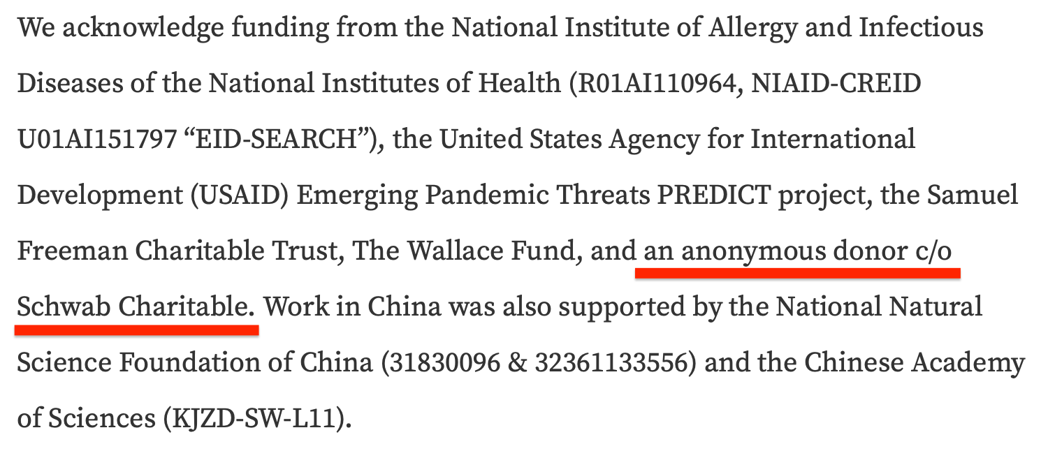 However, I have learned that Daszak is now being financed through an anonymous donor using a Schwab Charitable fund account.