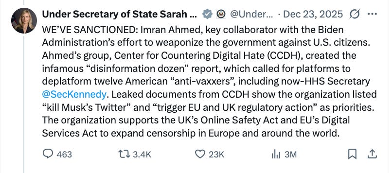 In a thread on X, Ms. Rogers posted the names of all 5 individuals, explaining why action was being taken against them. Citing reporting by myself and Matt Taibbi, she noted that one of these individuals is British political operative Imran Ahmed who runs the Center for Countering Digital Hate (CCDH).