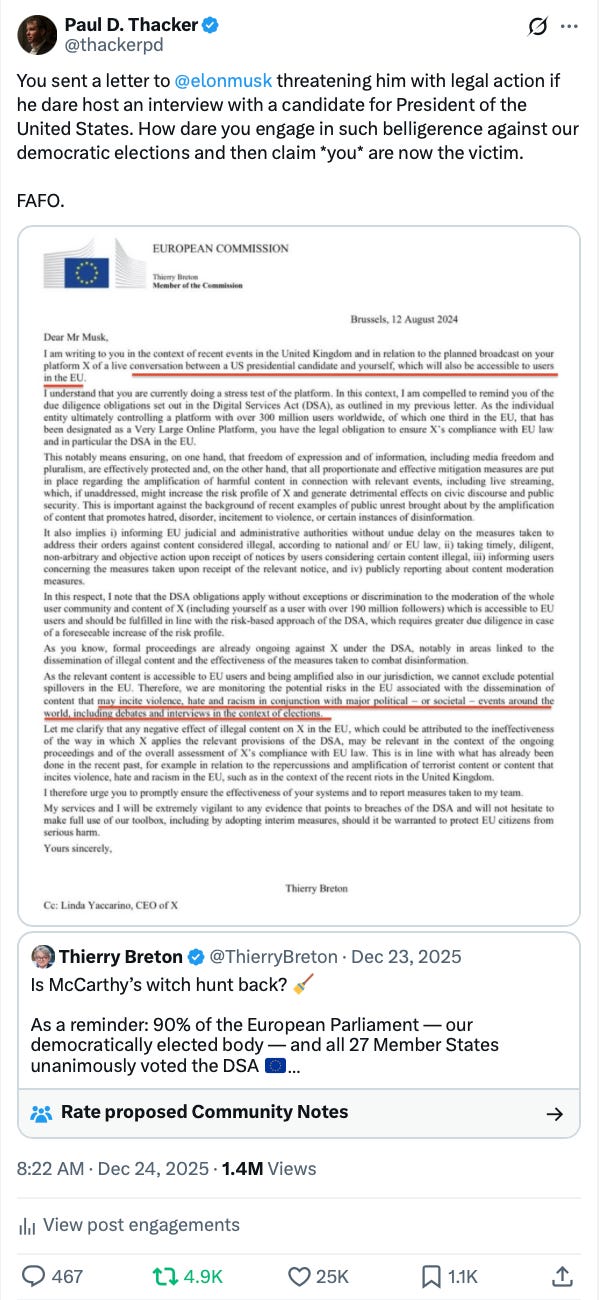 There was a flood of anger when the State Department took action. For example, European diplomat, Thierry Breton called the ban against him a McCarthy witch hunt. I pointed out that he had interferred in U.S. election by threatening Elon Musk with legal action if he hosted Donald Trump on X.