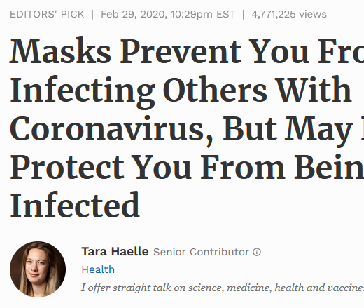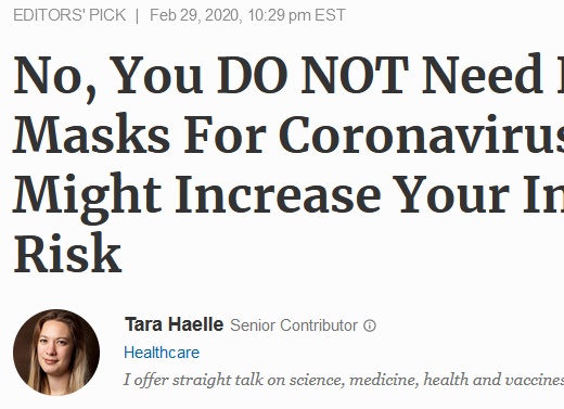 I contacted the AHCJ’s Tara Haelle on Twitter and several times by email for comment, and she sent my questions to the AHCJ’s president who did not respond. Since the pandemic’s beginning, Haelle has faced an onslaught of criticism for giddy, ungainly takes on COVID medical research. In one example, Haelle wrote an essay for Forbes titled, “No, You DO NOT Need Face Masks for Coronavirus—They Might Increase Your Infection Risk.” Haelle later reverted her thinking and changed the title to “Masks Prevent you From Infecting Others With Coronavirus, But May Not Protect You From Being Infected.”